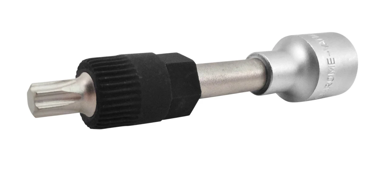 - T50 Torx bit end locks alternator in place while splined sleeve inserts into pulley