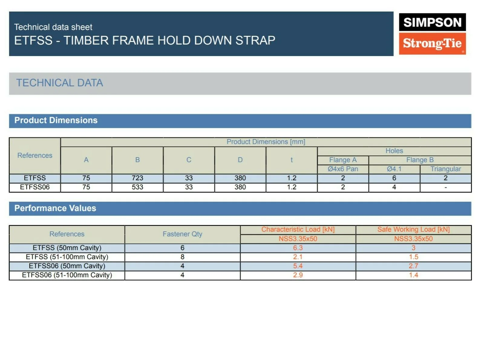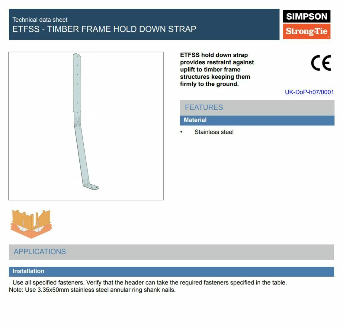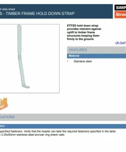 The Simpson Strong-Tie ETFSS Hold Down Strap is a high-strength, stainless steel restraint system designed to secure timber frame structures against uplift forces. Slim yet incredibly robust at just 1.2mm thick, the ETFSS is the first timber frame strap to be CE marked, meeting both NHBC and NSAI technical requirements for compliance and performance in modern construction.