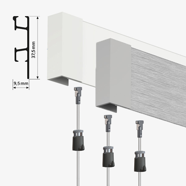 ARTITEQ Click Rail PRO Gallery Hanging Set is available in two-meter length. ARTITEQ rails are made from durable aluminium and can be cut to size with a hack saw. End caps protect rail ends. End caps have a small gap in them for connecting wires. It means you can install the rail snugly wall to wall if needed. Please ensure you leave 6mm on each side for the end caps when cutting.