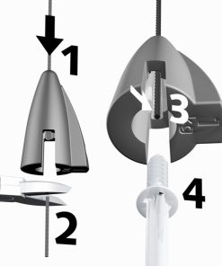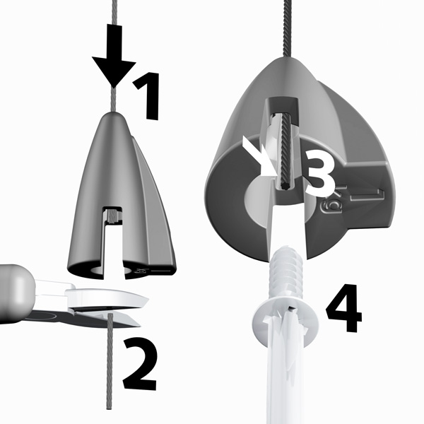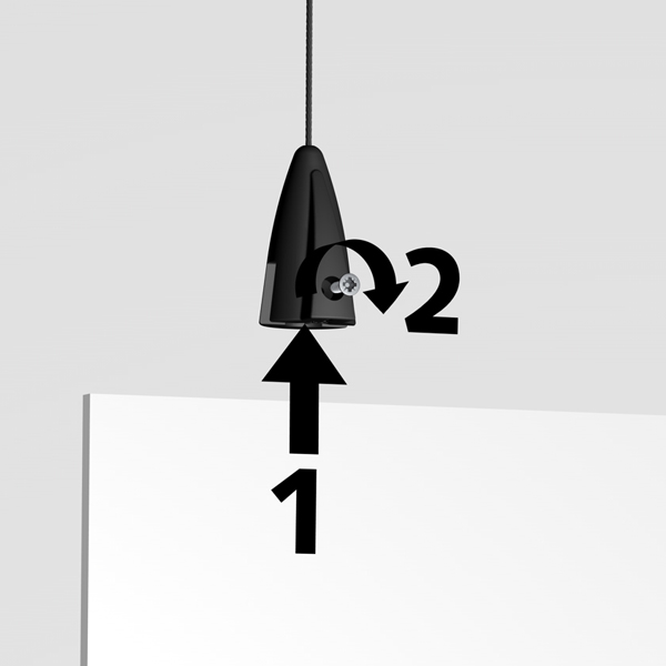 Panel Grip allows you to anchor your signage to a wire hanging off the ceiling. The maximum panel thickness it can grip is 4mm. The panel is secured in the grip by a screw. We recommend using two Grips per panel as it helps level it. It is also more aesthetically pleasing.