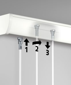 The Up Rail is supplied powder coated in pure white colour, which means you can paint it in any colour you like or install it as-is. There are several choices in terms of what wires you can use to hang your artwork. One of the most popular is the Twister Hanging Wire which you can connect anywhere along the rail.