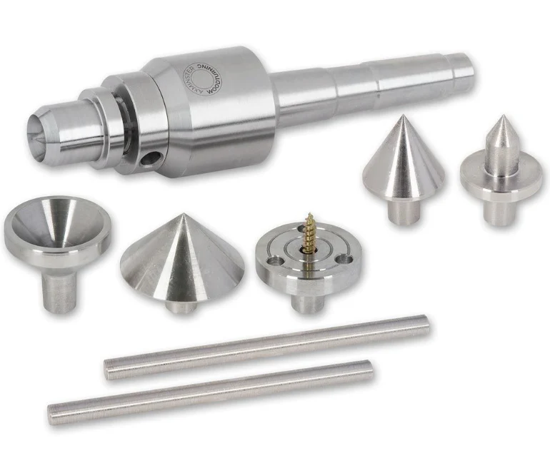 In addition to the standard tips there are three additional tips, included which will further increase the scope of the centre. A 30mm diameter mini faceplate with a central screw which is very useful when turning long stemmed goblets, a 90° pipe centre for use when locating in on a pre-bored hole and a conical centre for quick centring on small work or as a support when turning spherical forms.