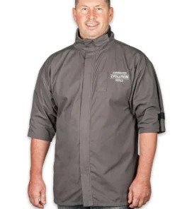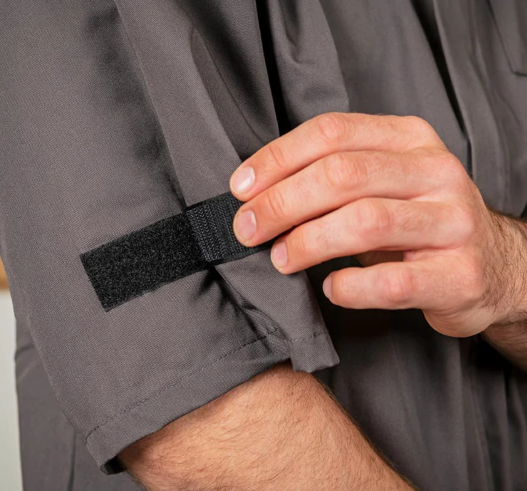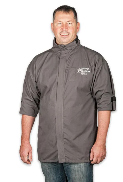 At the collar, a zip garage prevents the zip slider from scratching your neck. The high collar has a hook and loop tab at the side to adjust the fit, keeping shavings out without adding extra material bulk under your chin. The back of the collar is made of soft stretch knitted fabric adding to your comfort and allowing complete freedom of movement. A great deal of thought went into the collar design to ensure it does not compromise safety when wearing a powered respirator.