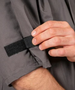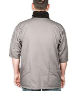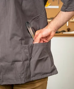 The short sleeves mean there is no loose material near the moving workpiece. Tabs on the sleeves allow you to adjust the fit on the upper arm. There is a small breast pocket to keep your pencil handy and two large pockets at the rear where they won’t fill with shavings and sawdust, and are useful for tools or snacks.
