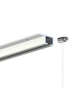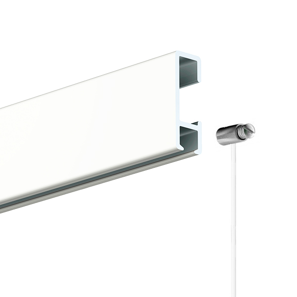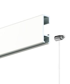 It allows you to hang pictures using a double rail system with one rail installed at the top of your wall or on the ceiling, and the other one at the bottom of your wall or on the floor. It’s a great solution for e.g. shop displays because it prevents pictures or frames from swinging. The clamp itself is fairly small. It is only 10mm tall and 5mm in diameter.