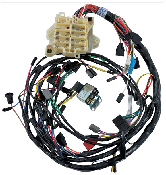 This harness includes wiring for headlight, wiper/washer, flasher, turn signal, horn and ignition switches, panel gauges/lights and heater. Also includes the fuse block and bulkhead disconnect.