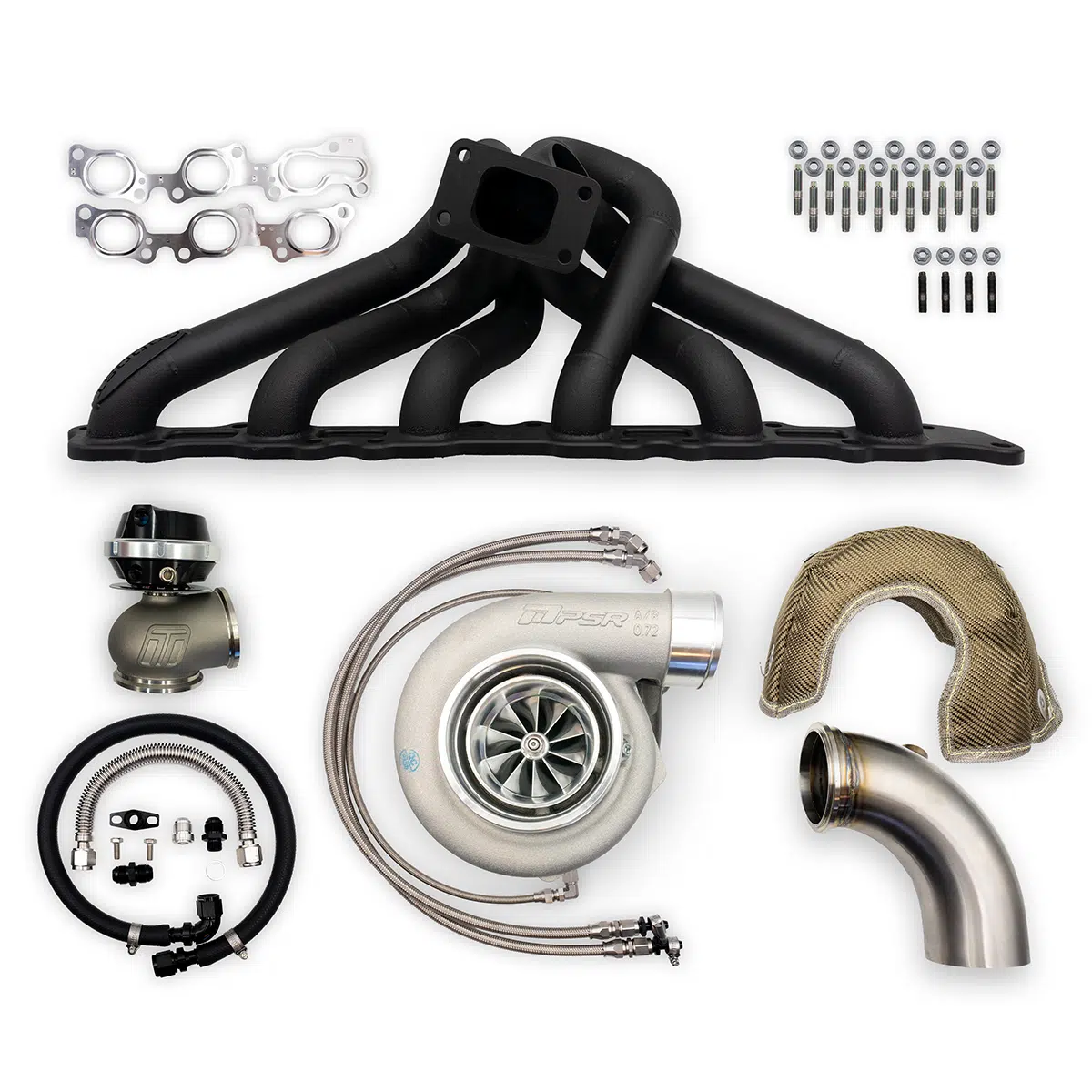 HD Auto 1FZ-FE Hotside Kit, – Suited for High Horsepower applications, this kit features a 6BOOST High mount manifold, Pulsar Next GEN turbocharger, Turbosmart 50mm Pro-Gate and essential components for Fitting the turbocharger – Fabrication required to install