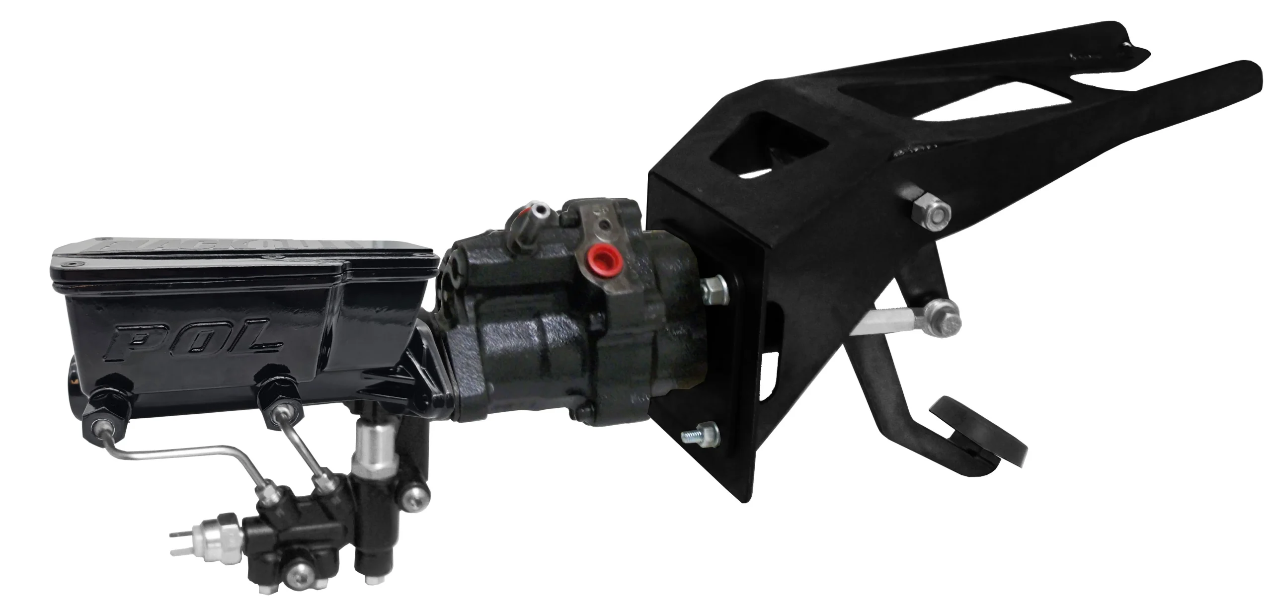 Our Hydropower hydraulic brake assist power booster fits 1953-56 Ford F-100 trucks and generates up to 1800psi of line pressure to the brake calipers. It is fitted with a POL or Wilwood master cylinder and adjustable proportioning valve. This kit is powered by hydraulic line pressure from the power steering pump. Firewall and valve cover clearance is equivalent to a 7″ diameter vacuum booster. The firewall brackets are correct for 53-56 Ford truck applications.