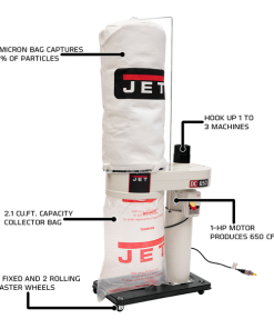 JET Model 650 dust collectors hook up to 1 to 3 machines at a time for optimum dust cleaning. Each 650 series dust collector comes equipped with a quick-install collection bag, single-stage design for economical and quiet operation, 4 casters for maneuverability and total portability, and permanently lubricated, fully enclosed, fan-cooled motors for continuous duty. An optional remote control is radio frequency so there is no need for line of sight to turn the machine on and off.