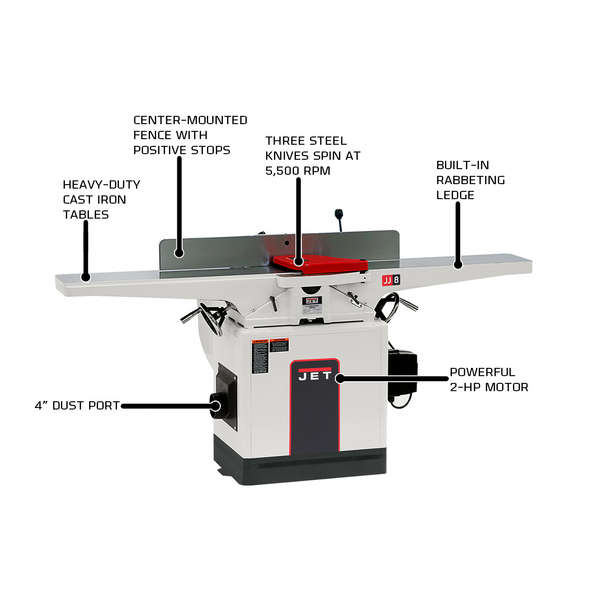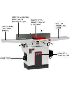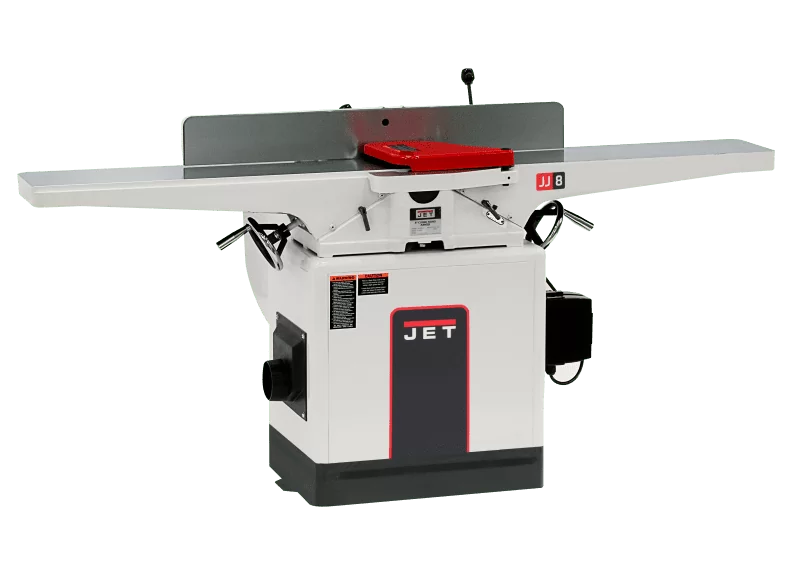 It’s time to skip the hand tools and graduate to the JET JWJ-8CS 8” long bed jointer. Its 2HP motor runs quietly and smoothly. Its front-mounted table adjustment handwheels make quick, easy and accurate corrections. The two-way tilting fence with positive stops at 45° and 90° makes bevel operations smooth. Extra-long heavy-duty cast iron infeed and outfeed tables with precision-machined finish allow jointing of longer boards without tipping. Best of all, it comes by JET’s industry-leading 5 year warranty.