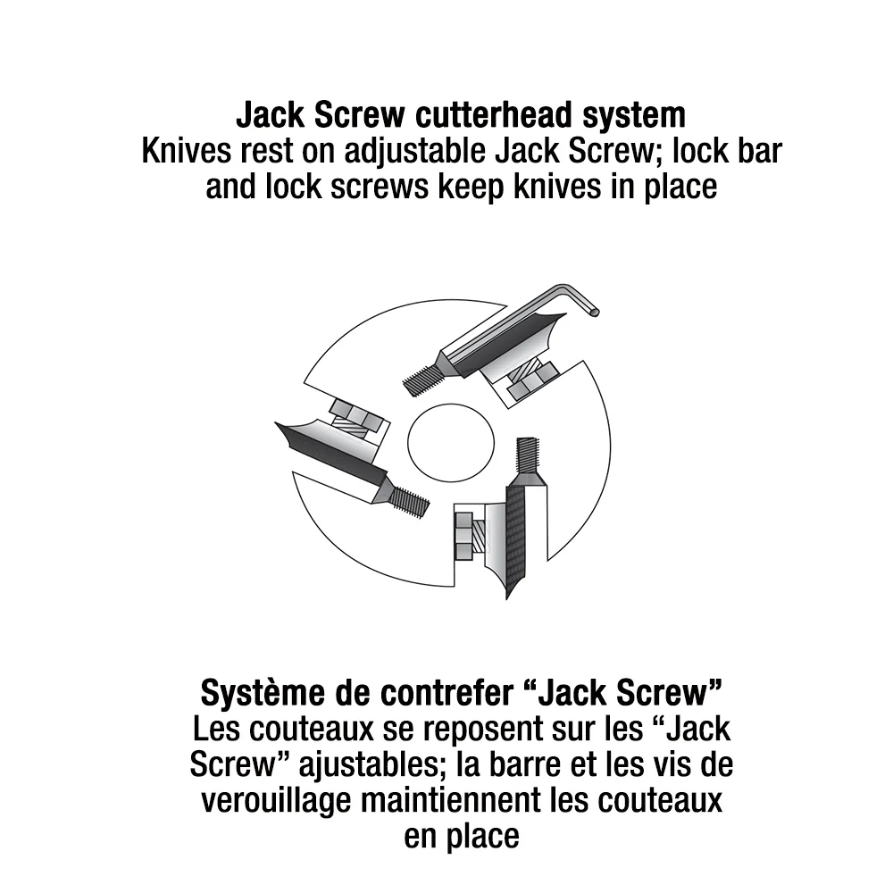 - Knives rest on adjustable Jack Screws; lock bar and lock screws keep knives in place