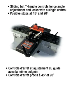 • Cast iron fence bevel controls with positive stops at 45 degrees and 90 degrees