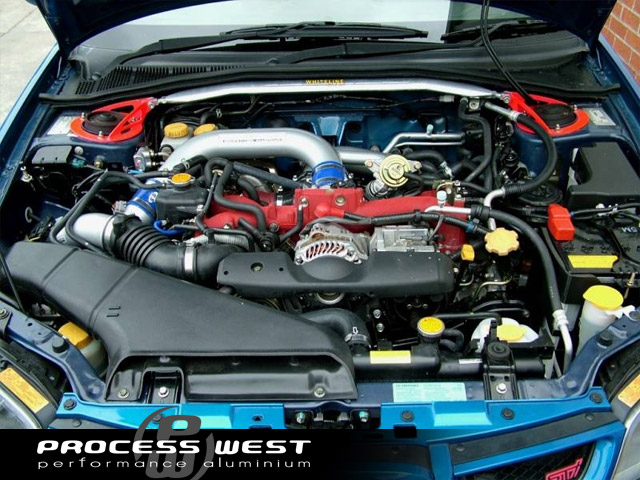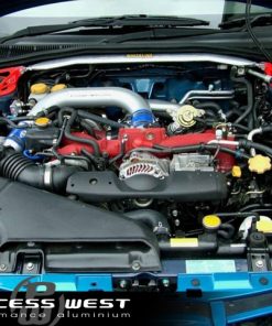 We wanted to achieve minimal intercooler piping length. The way we did this was to route the intercooler plumbing from the turbo under the engine instead of over it. By using this path we have negated the need to replace the factory radiator over flow bottle , negated the need to bend fuel line out of the way to make clearance and kept a very neat engine bay appearance.