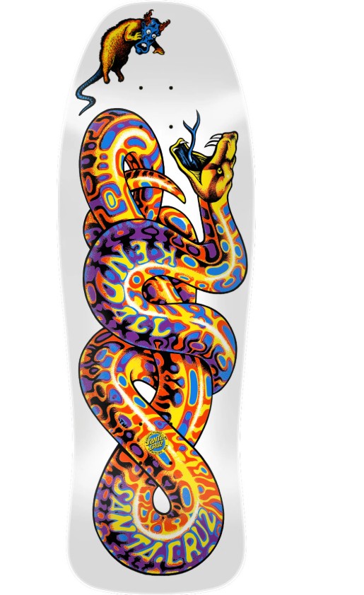 Santa Cruz Skateboards Jeff Kendall Snake Reissue deck featuring spot matte graphics on full dip white with 2025 Reissue laser engraved decktop logo.