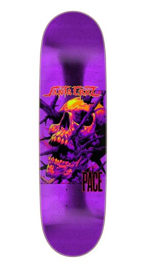 Santa Cruz Skateboards Rob Pace Deathrap Remix Pro 7 ply deck with spot gloss & raised ink graphics and violet metallic foil.