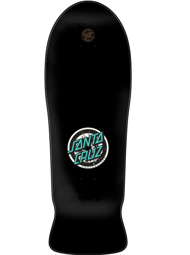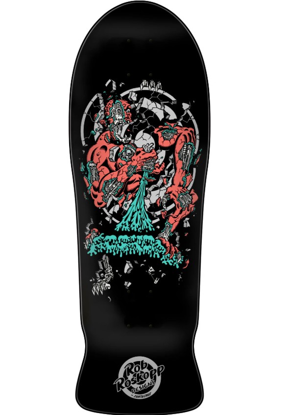 Santa Cruz Skateboards Rob Roskopp Four Reissue deck featuring newly replicated OG shape with old school hole pattern and remastered spot matte graphics on full dip black paint and 2025 reissue laser decktop logo.
