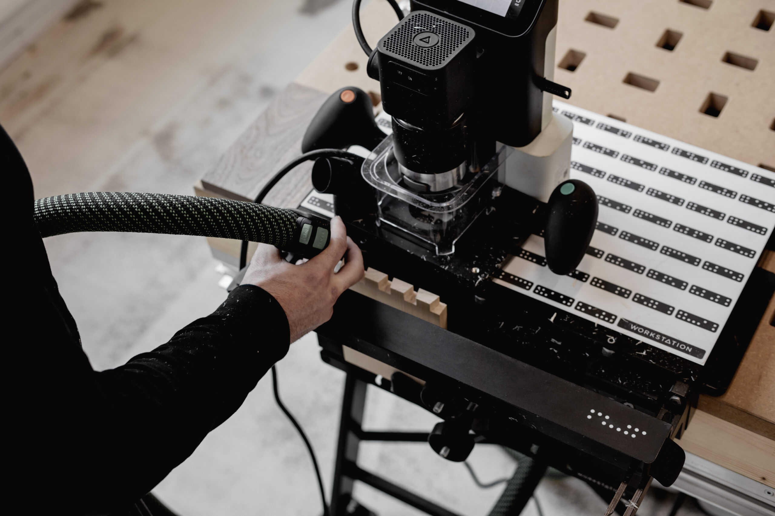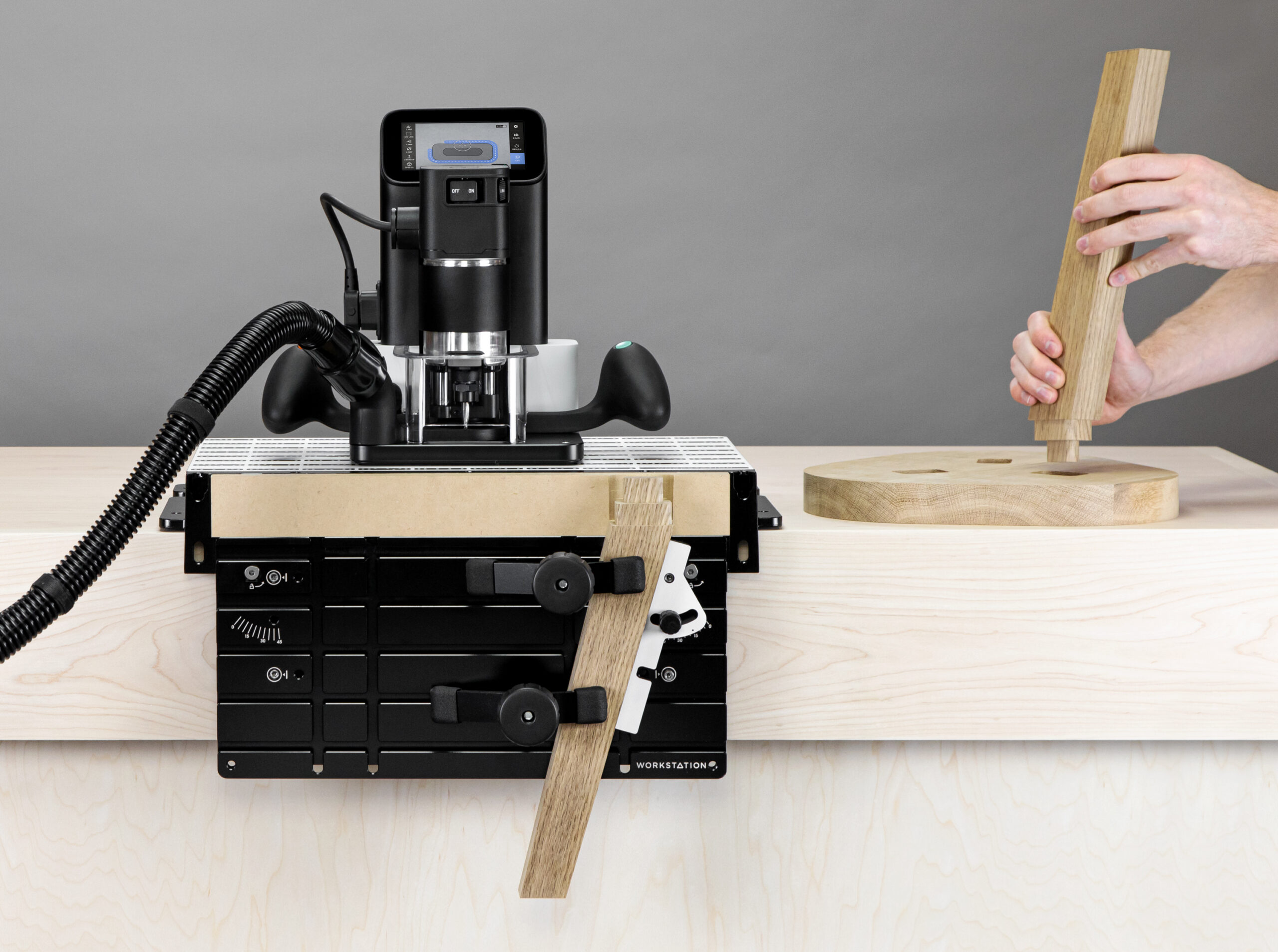 | A key advantage of the Origin Handheld CNC Router is its flexibility in machining small, precise parts like mortise and tenon joints and box joints. The Shaper Workstation lets you enjoy that flexibility easily and efficiently, using a precise vertical clamping surface and a table imprinted with the ShaperTape vision pattern so the router can precisely locate itself. Beautifully engineered as a system to offer perfect 90° registration between the table and the clamping face, and across the clamping face using the retractable registration pins. Two clamps are included, which slide into T-slots in the face. Adjustable support arms and a support bar are provided for the router to ride on. The shelf provides support from below and is easily adjusted with the large quick-release lever. An angle fence is also included for clamping pieces at up to 45° to the table along the clamping face.A key advantage of the Origin Handheld CNC Router is its flexibility in machining small, precise parts like mortise and tenon joints and box joints. The Shaper Workstation lets you enjoy that flexibility easily and efficiently, using a precise vertical clamping surface and a table imprinted with the ShaperTape vision pattern so the router can precisely locate itself. Beautifully engineered as a system to offer perfect 90° registration between the table and the clamping face, and across the clamping face using the retractable registration pins. Two clamps are included, which slide into T-slots in the face. Adjustable support arms and a support bar are provided for the router to ride on. The shelf provides support from below and is easily adjusted with the large quick-release lever. An angle fence is also included for clamping pieces at up to 45° to the table along the clamping face. |