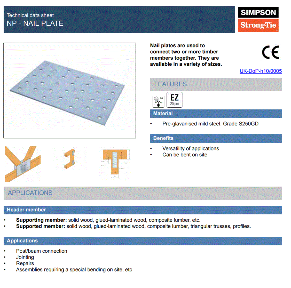 The Simpson Strong-Tie NP40/120 Nail Plate is a multi-purpose timber connector, designed for joining two or more wood elements in the same plane. Made from 1.5mm pre-galvanised mild steel, this plate is strong, corrosion-resistant, and suitable for both interior and sheltered outdoor use. The compact 40mm x 120mm size makes it ideal for a wide range of general-purpose carpentry and joinery applications.