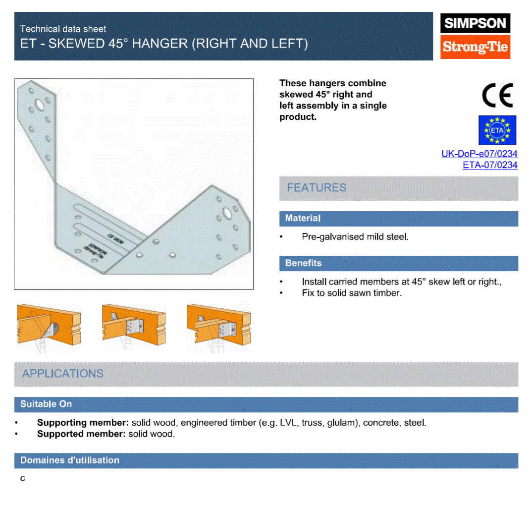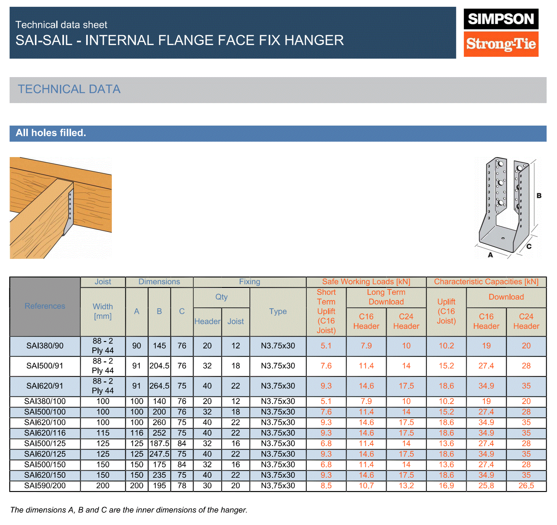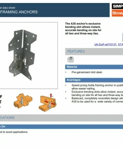 The Simpson Strong-Tie SAI380/90/2 is a high-strength, concealed face-fix joist hanger engineered for structural timber connections where a discreet, load-bearing solution is required. This hanger is suitable for both timber-to-timber and timber-to-masonry applications when used with approved chemical anchor systems such as Rawl R-KF2 and M12 studs. Manufactured from 2mm pre-galvanised steel, it offers robust durability in demanding environments.
