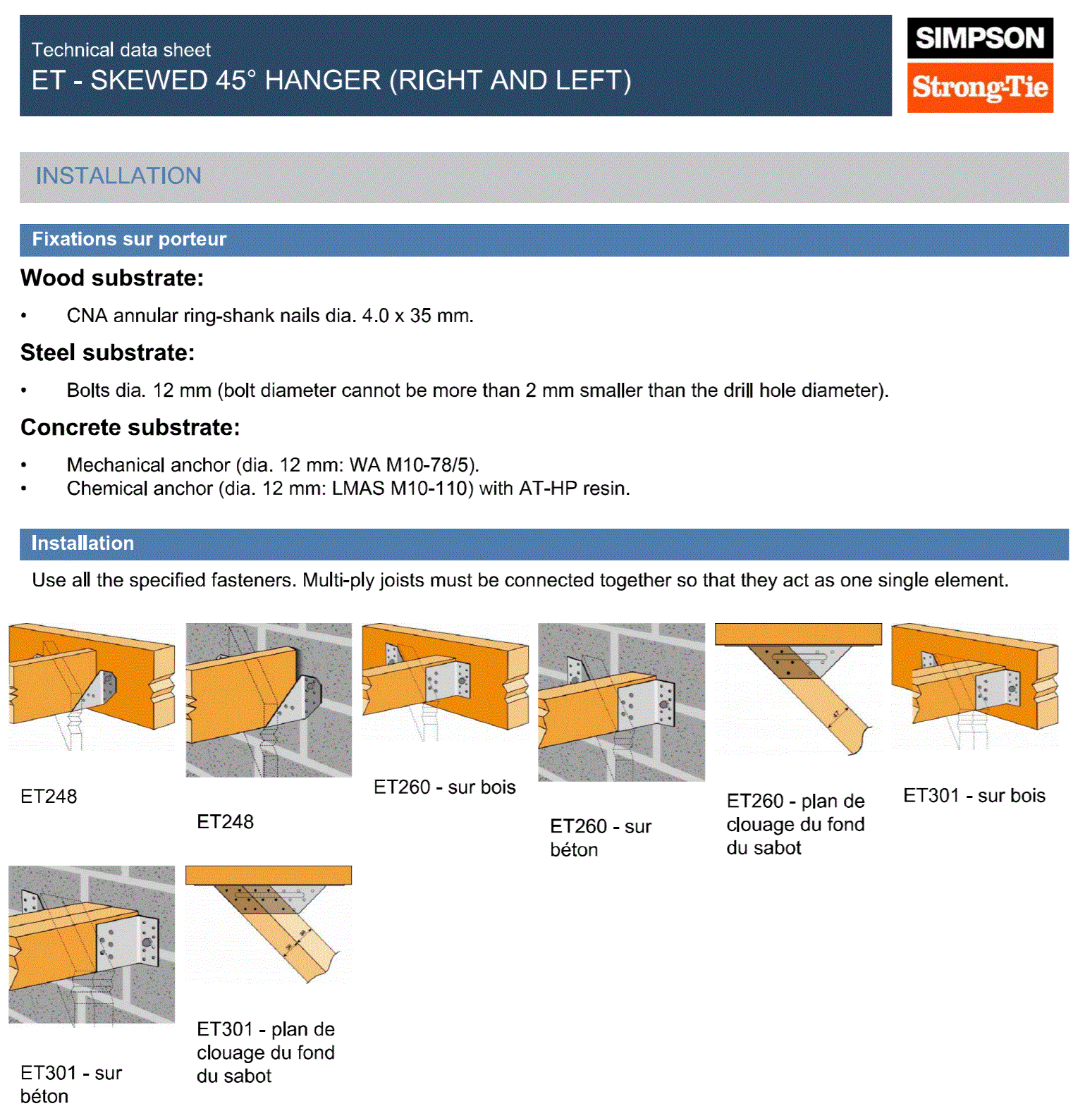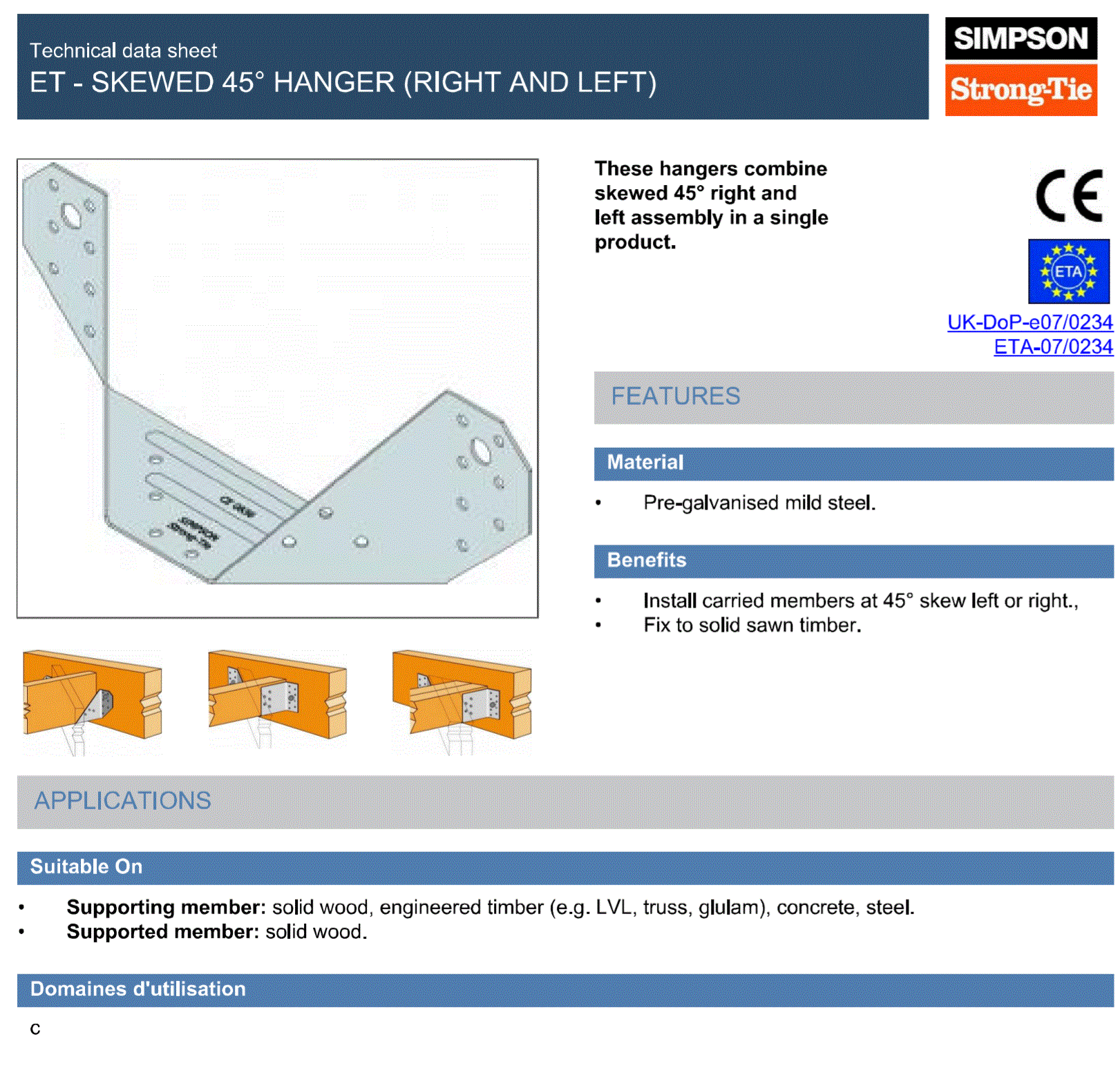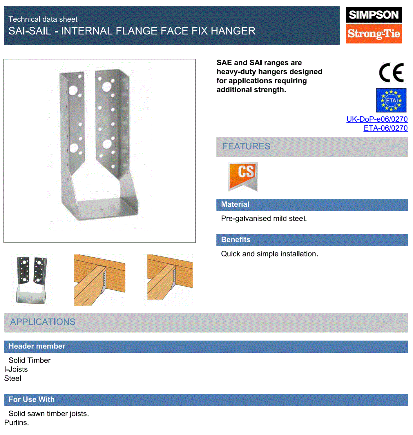 To prevent joist rotation, the hanger depth must cover at least 60% of the carried timber’s height, unless lateral restraint is added at the top. Always install in accordance with local building regulations and structural guidelines. Not recommended for marine or corrosive environments without further protective measures.