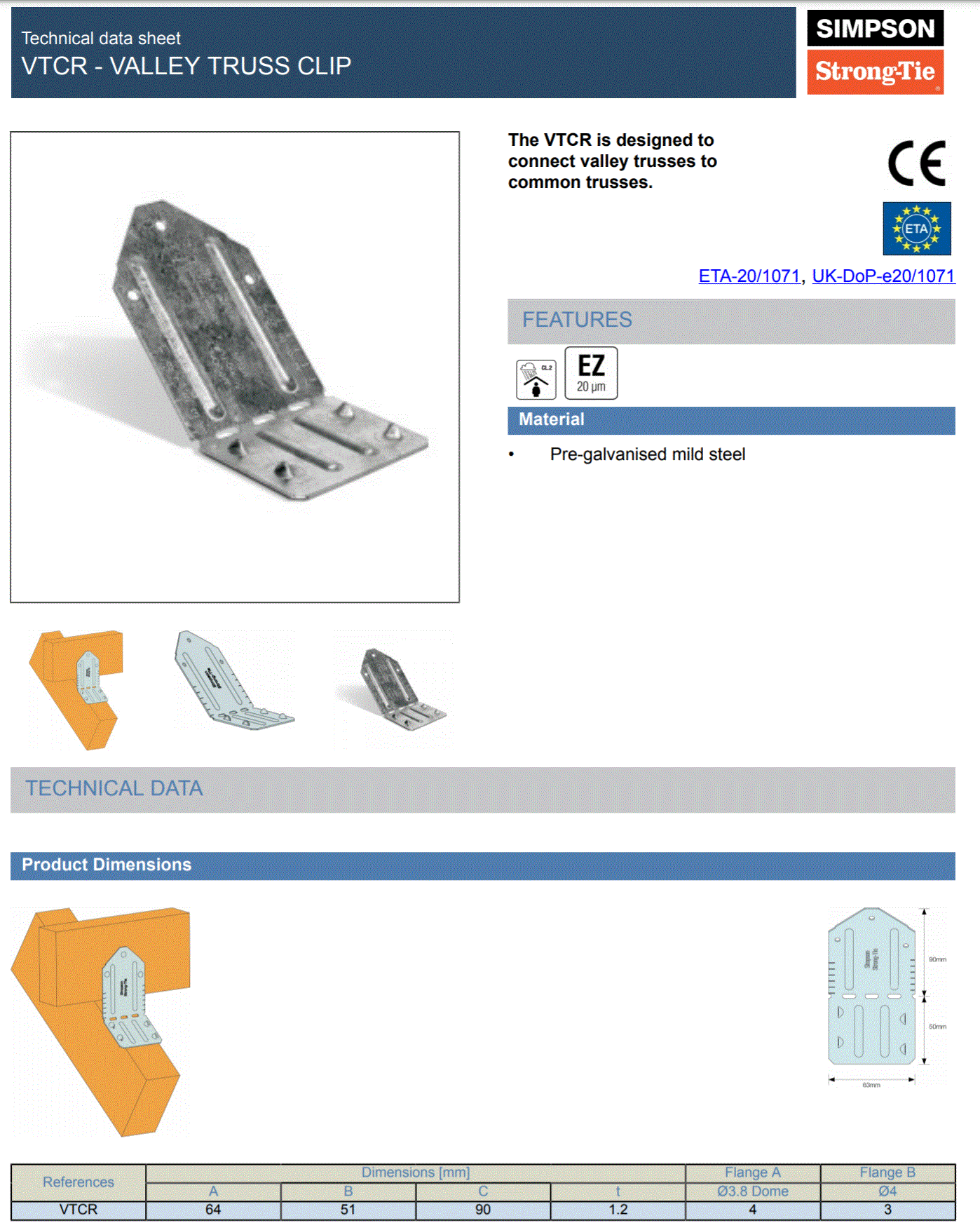 The Simpson Strong-Tie VTCR Valley Truss Clip is specifically engineered for connecting valley trusses to common trusses in timber roof structures. Designed to streamline both manufacturing and installation, this single-sided connector is ideal for new construction or retrofit applications. With its adjustable pitch range from 10° to 40°, the VTCR eliminates the need for bevelling or wedging the bottom chord, simplifying site work and saving on labour and materials.
