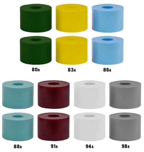 Venom SHR bushings are considered the highest quality bushings by experienced downhill riders and Longboard enthusiasts. If you have not tried a Venoms on your Racing board or Cruising longboard, you have not yet felt a rebounding truck. These bushings compress and release to perfect centre. Choose your durometer carefully. Don’t just purchase the bushing because the colour matches your skateboard. You should consider your weight and board shape carefully before ordering your bushings. Call us if you need additional assistance!