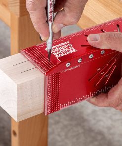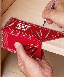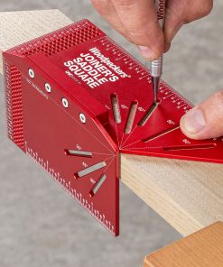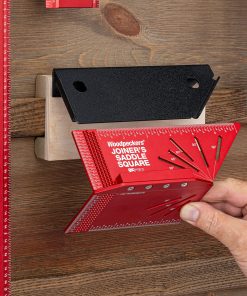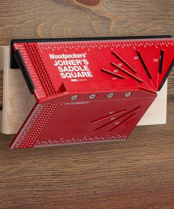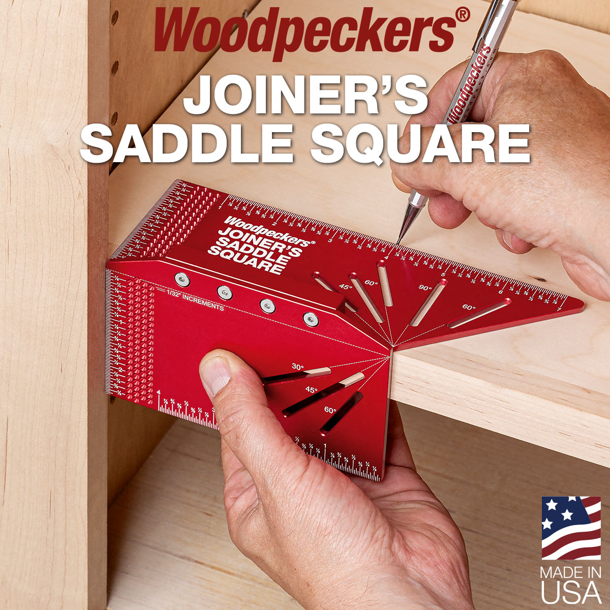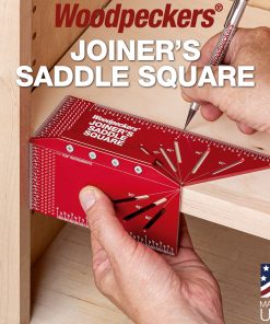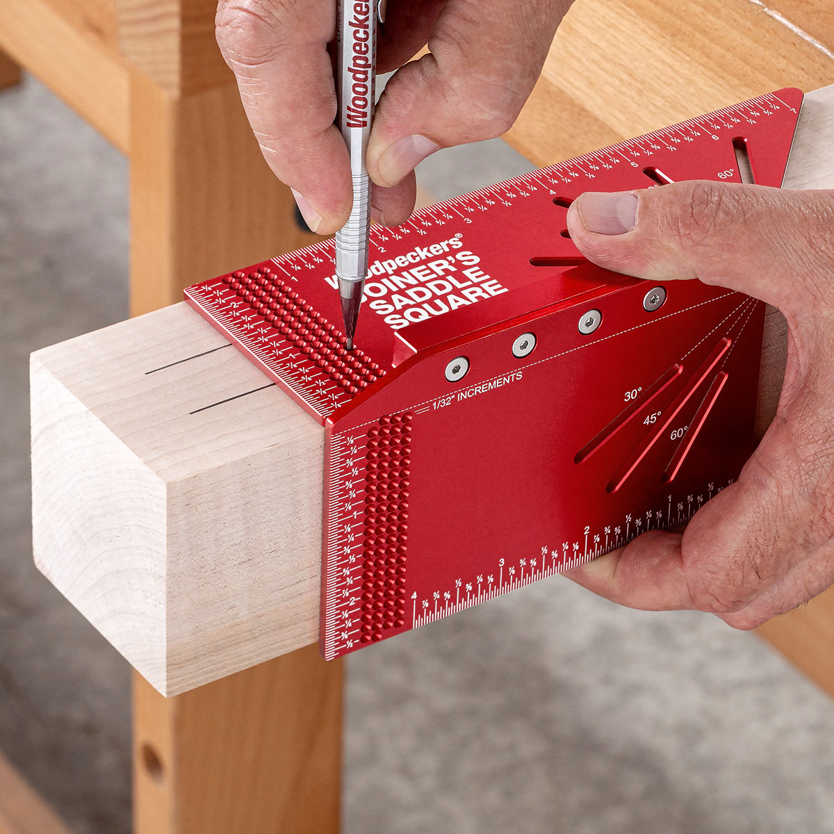 Let’s take a closer look at the scribing guides. A staggered array of 1mm holes on1/32″ centers perfectly guides a mechanical pencil for lines parallel to the edge of your board. Woodpeckers has built that feature into many of its tools, but there’s something different on the Joiner’s Saddle Square. Its unique right-angle design let us align one group from right to left and another left to right…no more trying to read upside down for half your scribing jobs.