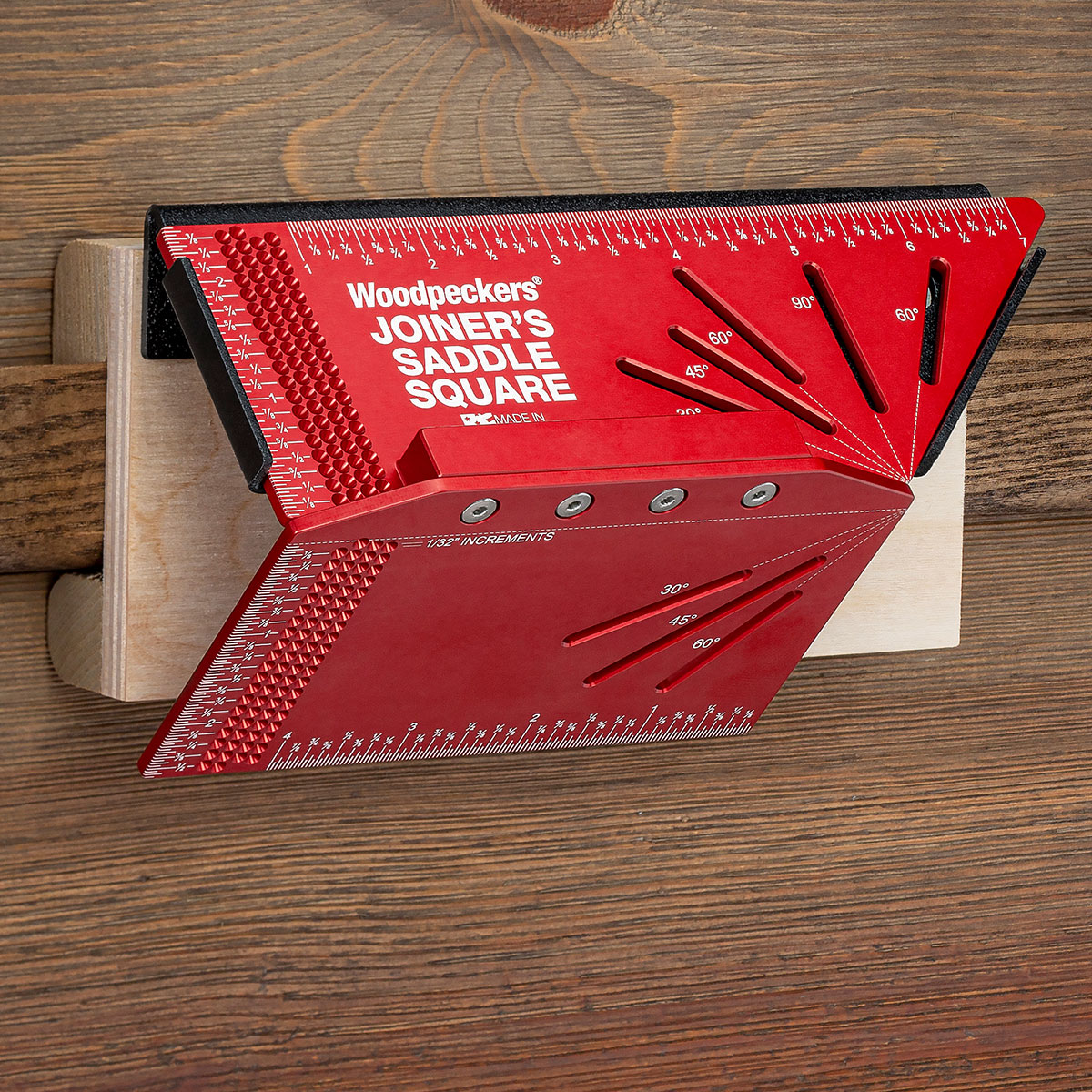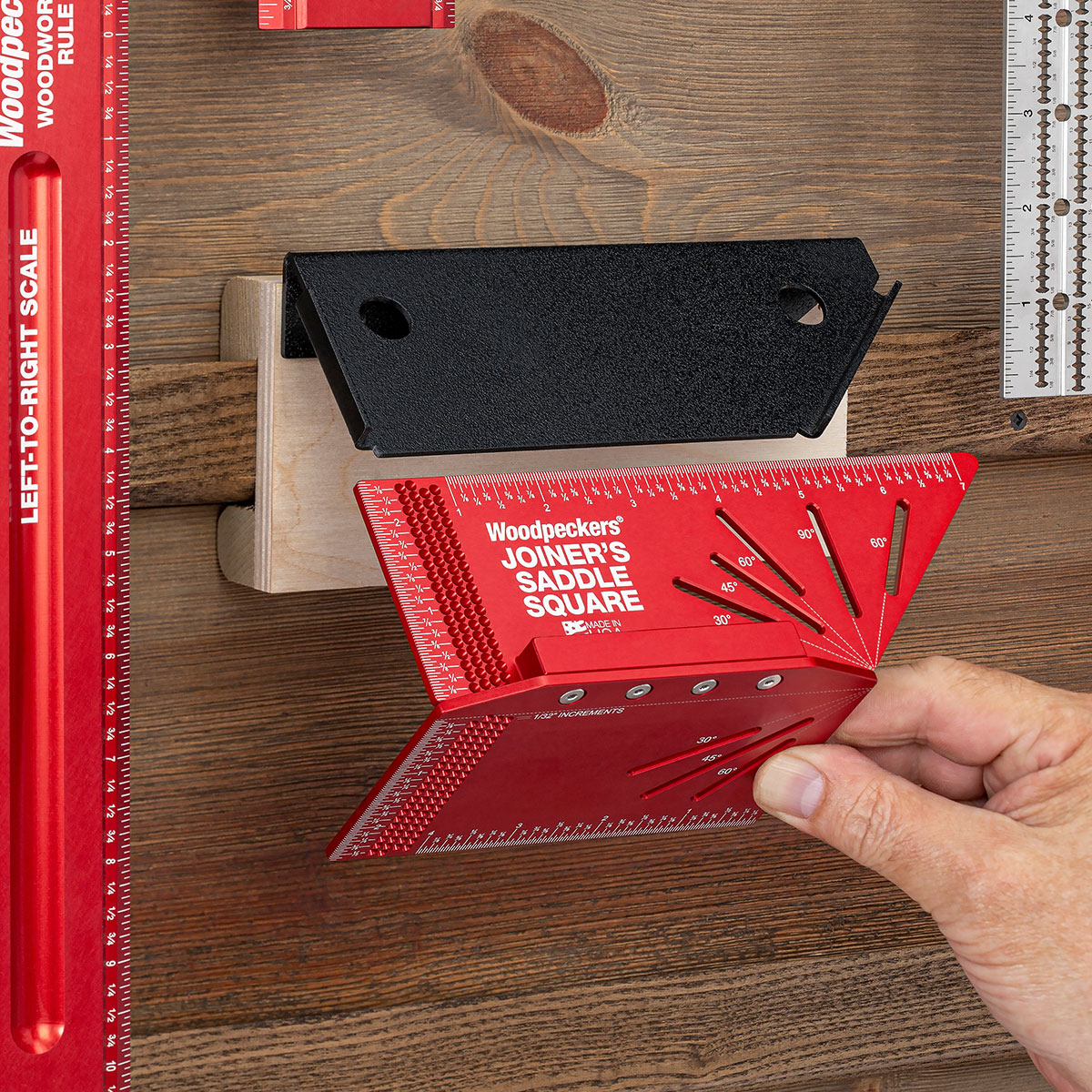 The more common 1-piece extruded squares that look similar typically can’t deliver the level of perpendicularity necessary for serious woodworking. By machining each side of the Joiner’s Saddle Square from a billet of solid aluminum and joining them with an extended boss, we’re able to hold very tight tolerances for both flatness and perpendicularity of the two sides. This tool delivers the level of precision necessary for accurate joinery.