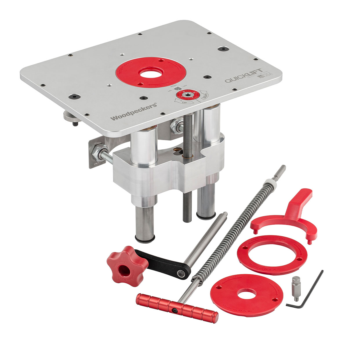 The Woodpeckers Premium Router Table Package with QuickLift combines precision and functionality. It includes a micro-dot laminate/MDF router table top, the QuickLift router lift, an adjustable stand, and a downdraft dust cabinet. Choose from different motor options to suit your needs.