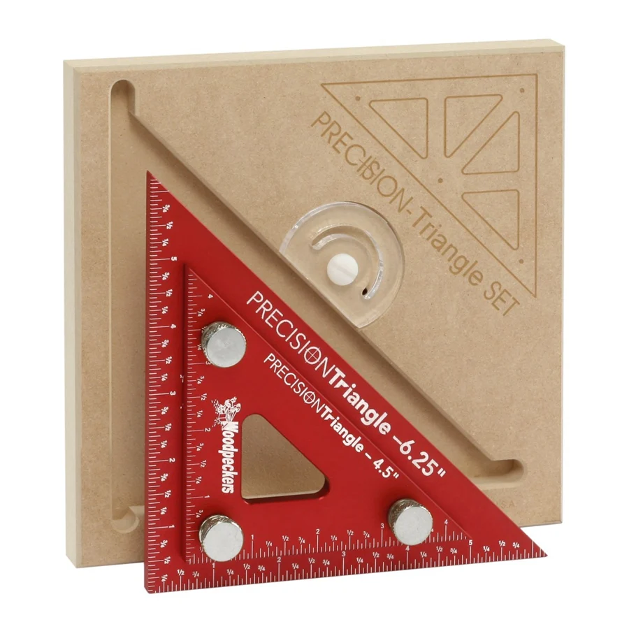 The design of our new PRECISION TRIANGLES were inspired from a small, apron pocket sized triangle I inherited from my Father In Law. As a pattern maker’s apprentice in the 40’s, he learned early on the value of this simple tool. Well, now you can to. We’ve manufactured these anodized aluminum triangles to extremely accurate standards and guarantee perpendicular accuracy to well within .001%. Both sides have been carefully laser engraved with inch markings. Includes (1) x 4.5″ and (1) x 6.25″ Triangle and storage board.