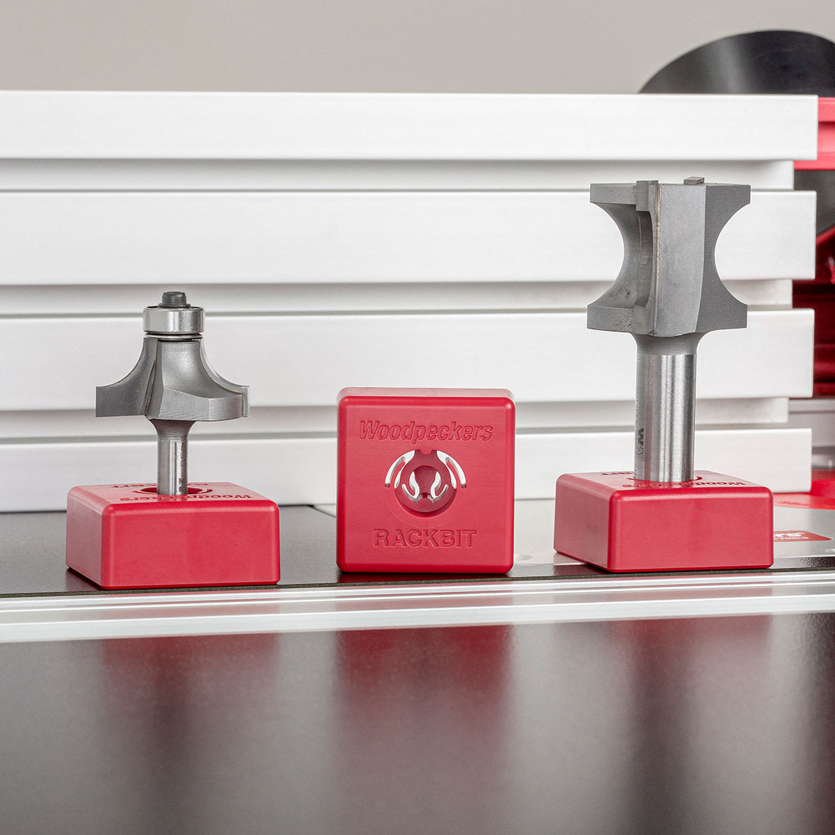 The RackBit Router Bit Storage System from Woodpeckers is designed to address the challenge of keeping router bits organized and accessible. As your collection of bits grows, this modular system adapts to your needs. It starts with molded bit bases that accommodate both 1/4″ and 1/2″ shank router bits. These bases feature a unique geometry with two levels and spring tension, ensuring a secure grip on the bits.